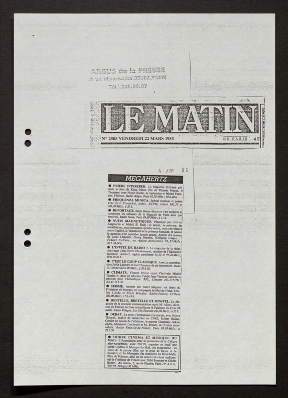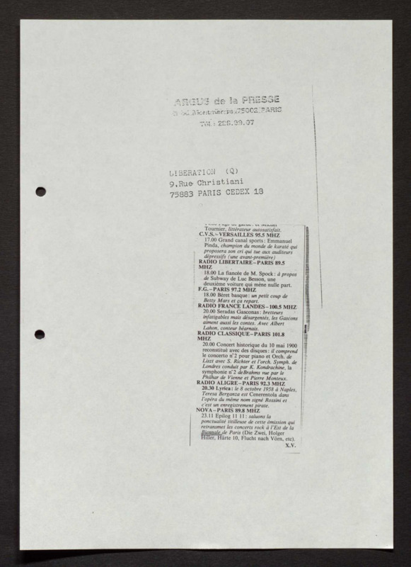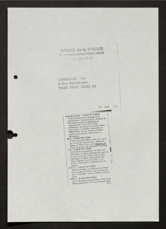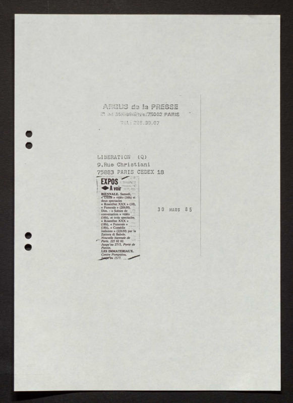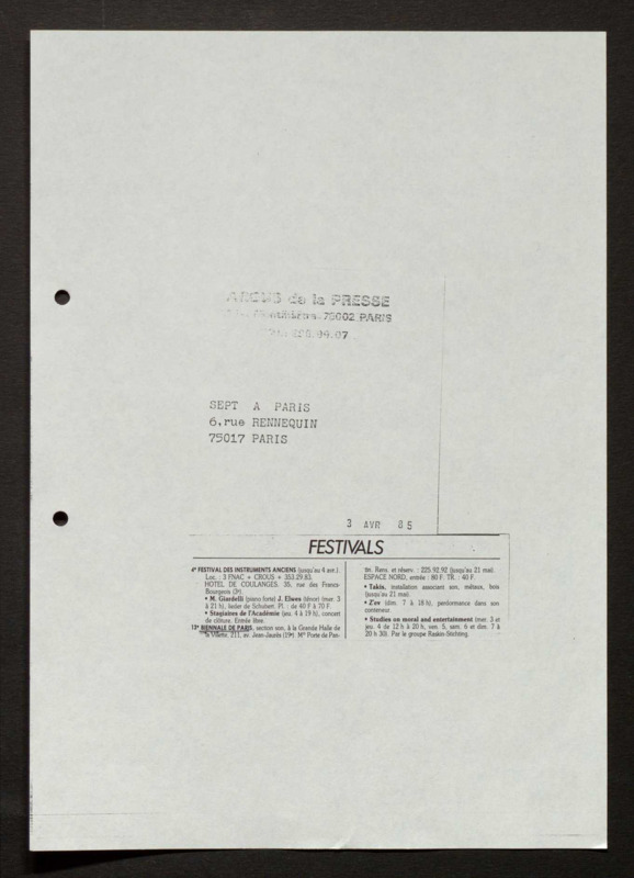 - Annonces mentionnant la section son à la 13ème Biennale de Paris, 1985